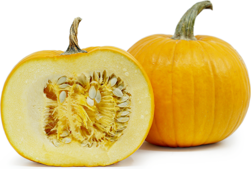 Encased in a moderately hard shell, the thick edible flesh of the pumpkin harbors a central multi-seed cavity. Pumpkins come in many different shapes and sizes. Their bright orange skin can be smooth, bumpy or vertically lined with ridges. Their flesh is orange and typically offers a sweet mild flavor, however some varieties bread specifically for carving will be bland and fibrous.