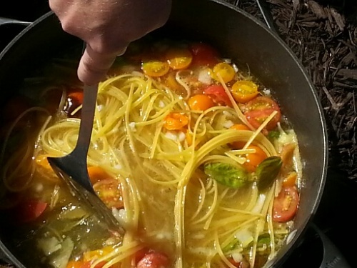 Put all in a pan (except cheese). Heat skillet contents to boiling. Stir often and set timer for 9 min. (times vary if using other types of pasta). Water should be nearly gone. Season to taste. Garnish with grated Parmesan cheese. Enjoy!