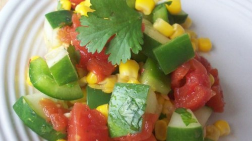 Prep: 10 m Cook: 10 m Ready In: 50 m Ingredients 1 medium cucumber, chopped 1 (8.75 ounce) can whole kernel corn, drained 1 (16 ounce) can stewed tomatoes, drained and sliced 1 green bell pepper, chopped 1 red bell pepper, chopped 2 tablespoons red wine vinegar 1 tablespoon crushed red pepper flakes 1/2 teaspoon garlic, minced 1/2 teaspoon cumin 1/4 teaspoon dried cilantro 1/4 teaspoon salt 1/8 teaspoon ground black pepper Directions In a large bowl, toss together the cucumber, corn, tomatoes, green bell pepper, red bell pepper, and red wine vinegar. Season with crushed red pepper flakes, garlic, cumin, cilantro, salt, and black pepper. Cover, and chill at least 30 minutes before serving. Printed From Allrecipes.com 7/17/2018: https://www.allrecipes.com/recipe/56136/mexican-cucumber-salad/